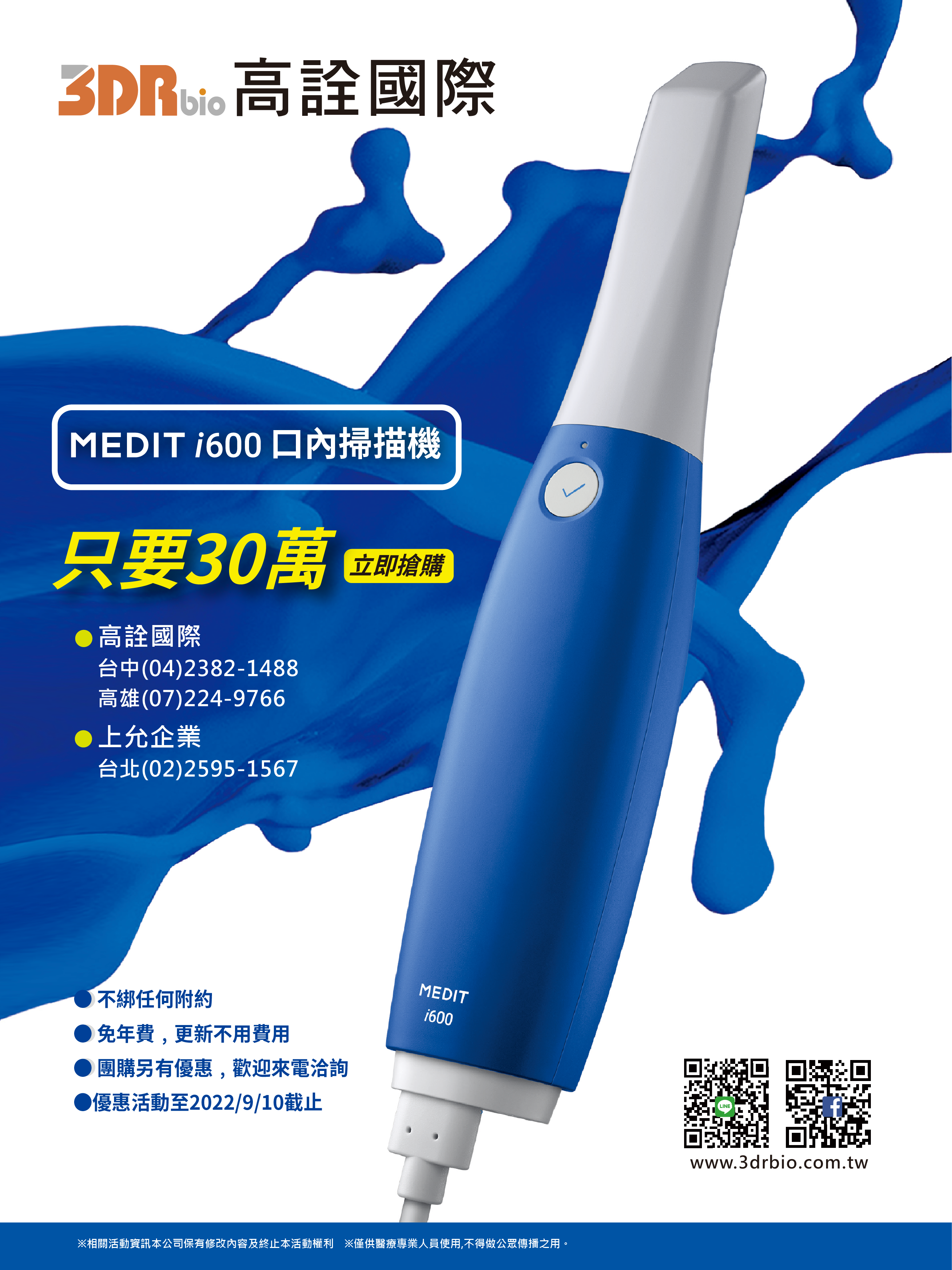 MEDIT i600口內掃描機 超優惠之外還完全免年費,不需要綁任何附約,全新藍光技術、180度翻轉式口掃頭、一鍵掃描便利好操作、快速流暢的掃描體驗,加速您作業流程,輕鬆又省時,趕快詢問入手!更多口腔修復耗材、數位牙科設備快來詢問。
